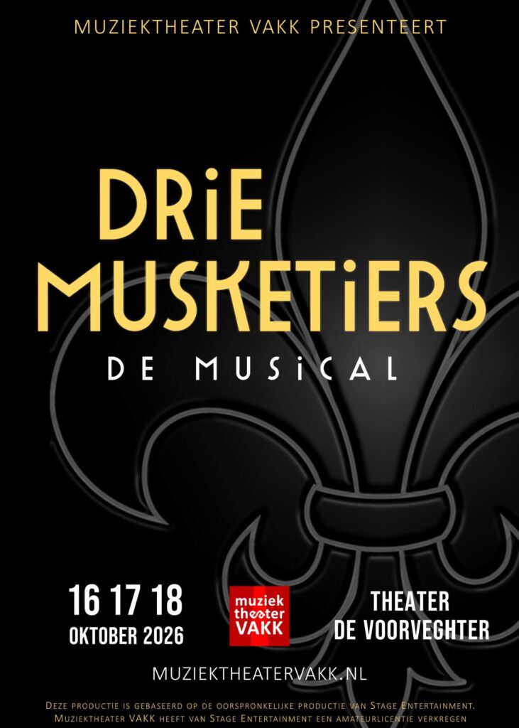 De musical voor volgend jaar staat ook alweer vast: dat wordt ‘Drie Musketiers’. Op woensdag 17 december zal ons creatief team haar plannen voor deze ‘Drie Musketiers’ presenteren. ‘Drie Musketiers’ wordt op 16, 17 en 18 oktober 2026 opgevoerd, uiteraard weer in De Voorveghter te Hardenberg.